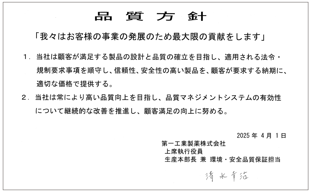 As a chemical partner conveying the essence of high functionality for the future, we will provide customers with safer, higher-quality products that maximally contribute to the development of their business. To realize this, we engage in quality control using the PDCA cycle based on our fundamental quality assurance and quality policy in an effort to improve quality and customer satisfaction.