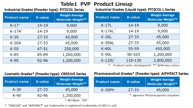 Polyvinylpyrrolidone (PVP) is a biocompatible, nonionic polymer that was developed in Germany in the late 1930s and was originally used in medical applications as a plasma volume expander. Today, owing to its high level of safety, PVP is widely used not only in general industrial products but also in pharmaceuticals, cosmetics, and many other fields.