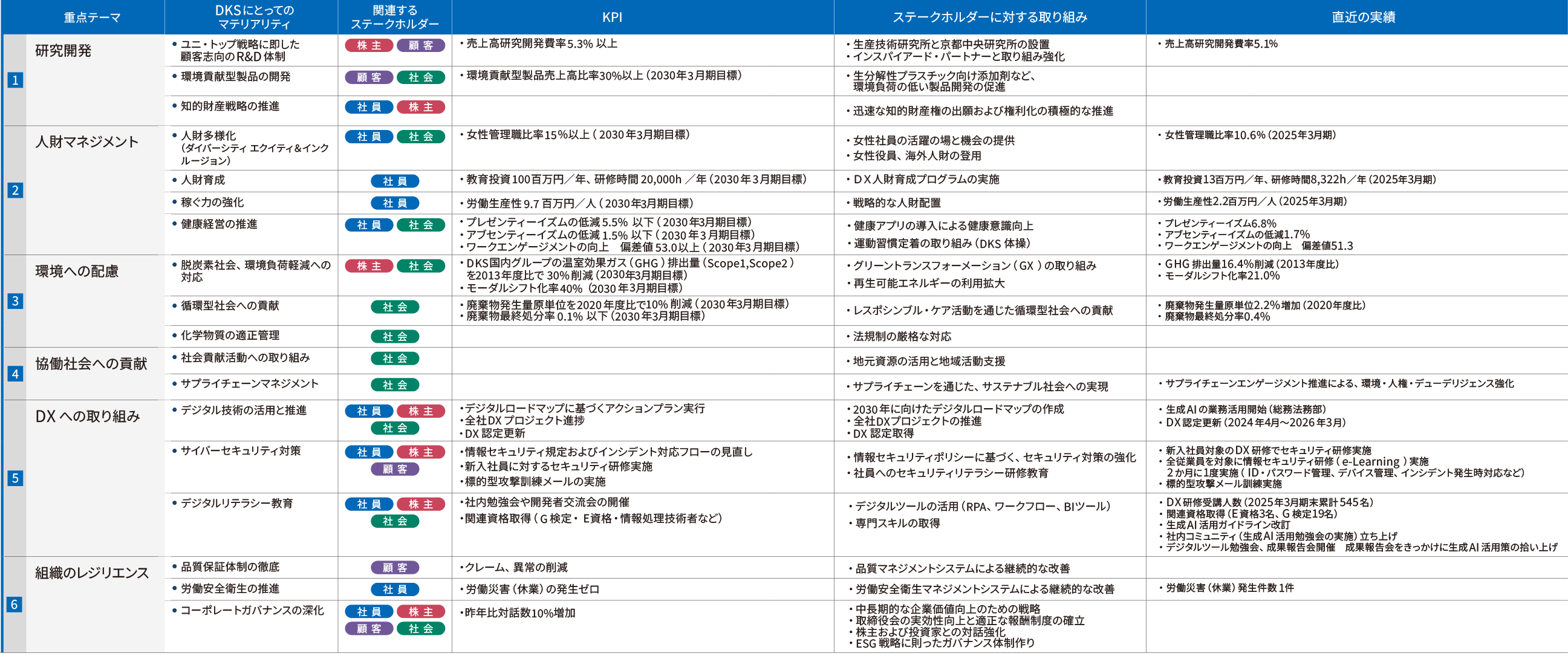 当社では、経営における長期的視野から取り組むべき重点テーマとそれに関連するマテリアリティを策定しています。社会的課題と企業理念をベースに、DKSとそのステークホルダーにとっての重要性という2つの軸から、6つの重点テーマを策定し、さらにこれらのテーマへの対応としての課題をマテリアリティとして特定しました。この特定にあたって、DKSにとって重要な国際社会からの要請を踏まえ、国連の持続可能な開発目標(SDGs)およびISO26000などのグローバルガイドラインなどを参照しています。