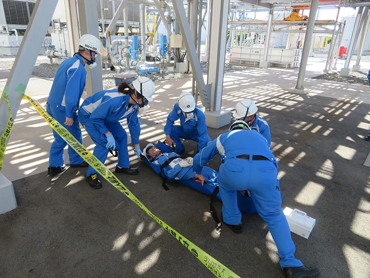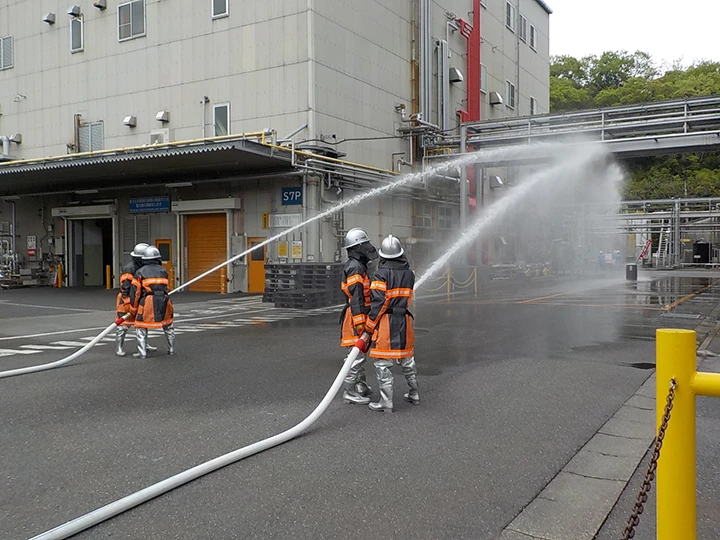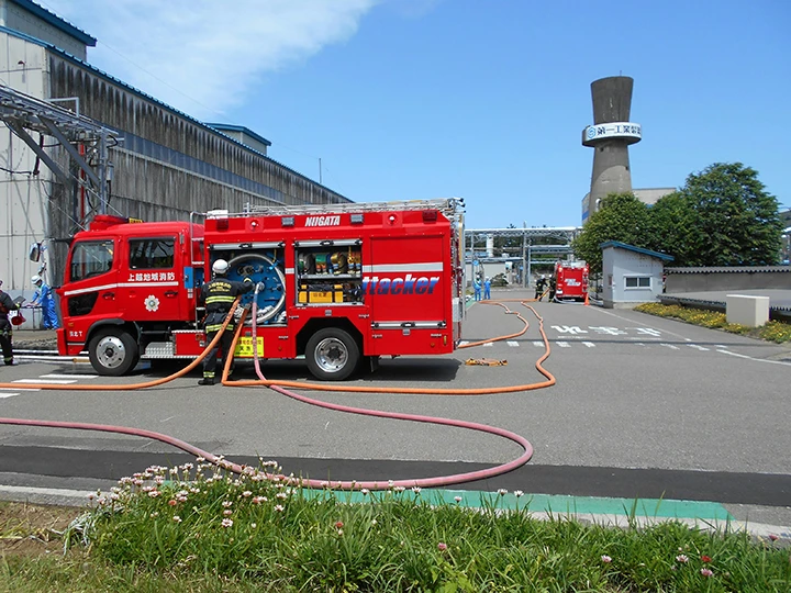 火災・爆発、地震、漏洩、停電など万が一の緊急事態が発生した場合に備えて、工場では保安防災体制を構築し、年度計画に従って防災訓練を繰り返し実施しています。また、近年の国内化学工場で発生した大規模な火災・爆発事故を受け、緊急時の保安防災マニュアルを整備し、万が一に備えています。防災訓練においては、消防署のご協力を得て合同で訓練を行うなど、地域と連携した訓練も行っています。化学メーカー特有の事故、災害の未然防止のため、今後も保安防災活動に取り組んでいきます。
