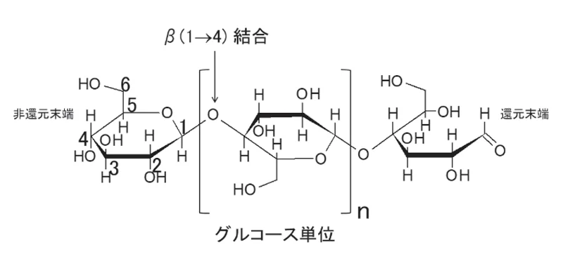 図1に示すように、セルロースはD-グルコース(グルコピラノース)がβ(1→4)グリコシド結合で直鎖状につながった天然高分子(多糖)で、植物細胞壁の主要な構造要素です[4]。